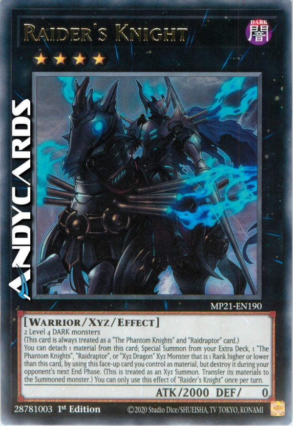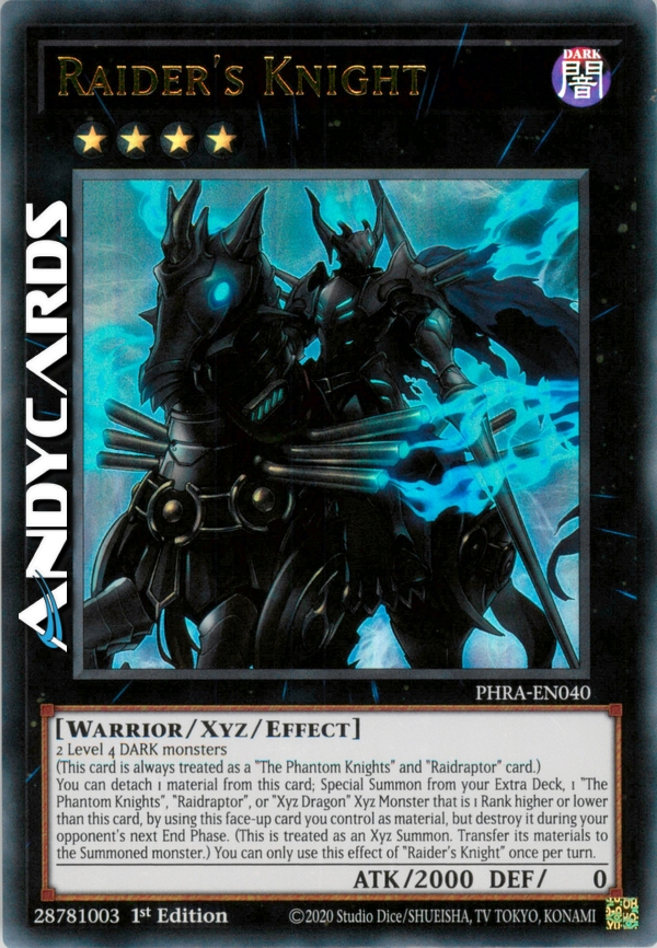You can detach 1 material from this card; Special Summon from your Extra Deck, 1 "The Phantom Knights", "Raidraptor", or "Xyz Dragon" Xyz Monster that is 1 Rank higher or lower than this card, by using this face-up card you control as material, but destroy it during your opponent's next End Phase. (This is treated as an Xyz Summon. Transfer its materials to the Summoned monster.) You can only use this effect of "Raider's Knight" once per turn.