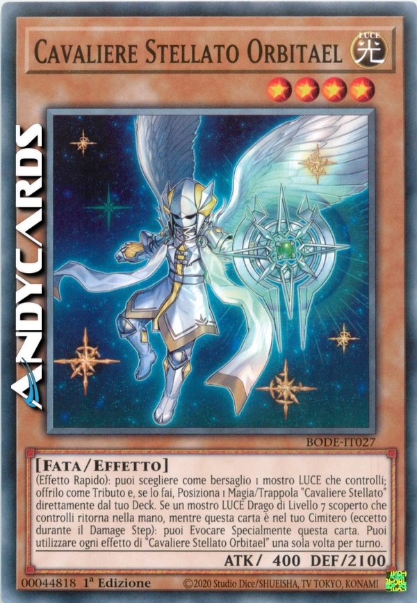 (Effetto Rapido): puoi scegliere come bersaglio 1 mostro LUCE che controlli; offrilo come Tributo e, se lo fai, Posiziona 1 Magia/Trappola "Cavaliere Stellato" direttamente dal tuo Deck. Se un mostro LUCE Drago di Livello 7 scoperto che controlli ritorna nella mano, mentre questa carta è nel tuo Cimitero (eccetto durante il Damage Step): puoi Evocare Specialmente questa carta. Puoi utilizzare ogni effetto di "Cavaliere Stellato Orbitael" una sola volta per turno.