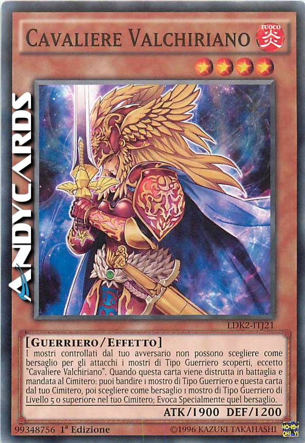 Il tuo avversario non può scegliere come bersaglio per gli attacchi i mostri di Tipo Guerriero scoperti, eccetto "Cavaliere Valchiriano". Quando questa carta viene distrutta in battaglia e mandata al Cimitero: puoi bandire 1 mostro di Tipo Guerriero e questa carta dal tuo Cimitero per scegliere come bersaglio 1 mostro di Tipo Guerriero di Livello 5 o superiore nel tuo Cimitero; Evoca Specialmente quel bersaglio.
