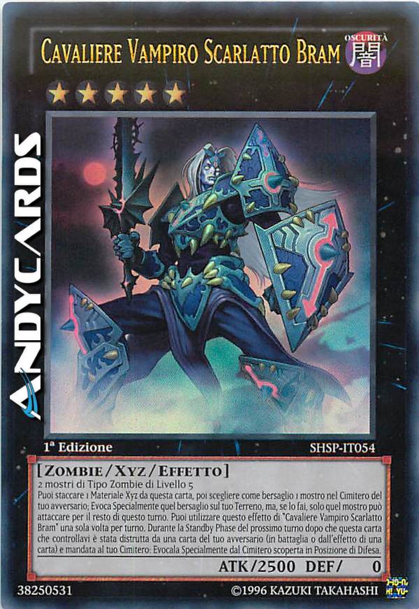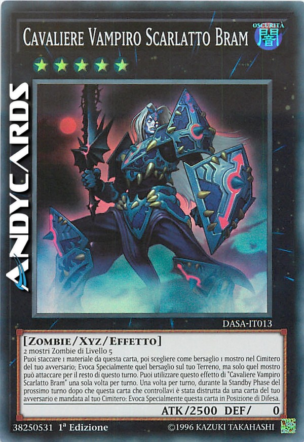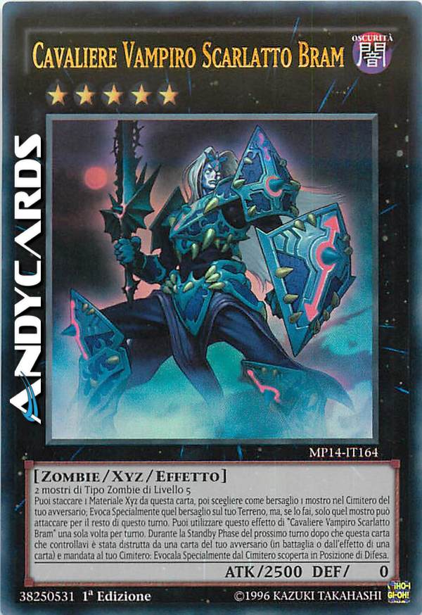 Puoi staccare 1 materiale da questa carta, poi scegliere come bersaglio 1 mostro nel Cimitero del tuo avversario; Evoca Specialmente quel bersaglio sul tuo Terreno, ma solo quel mostro può attaccare per il resto di questo turno. Puoi utilizzare questo effetto di "Cavaliere Vampiro Scarlatto Bram" una sola volta per turno. Una volta per turno, durante la Standby Phase del prossimo turno dopo che questa carta che controllavi è stata distrutta da una carta del tuo avversario e mandata al tuo Cimitero: Evoca Specialmente questa carta in Posizione di Difesa.