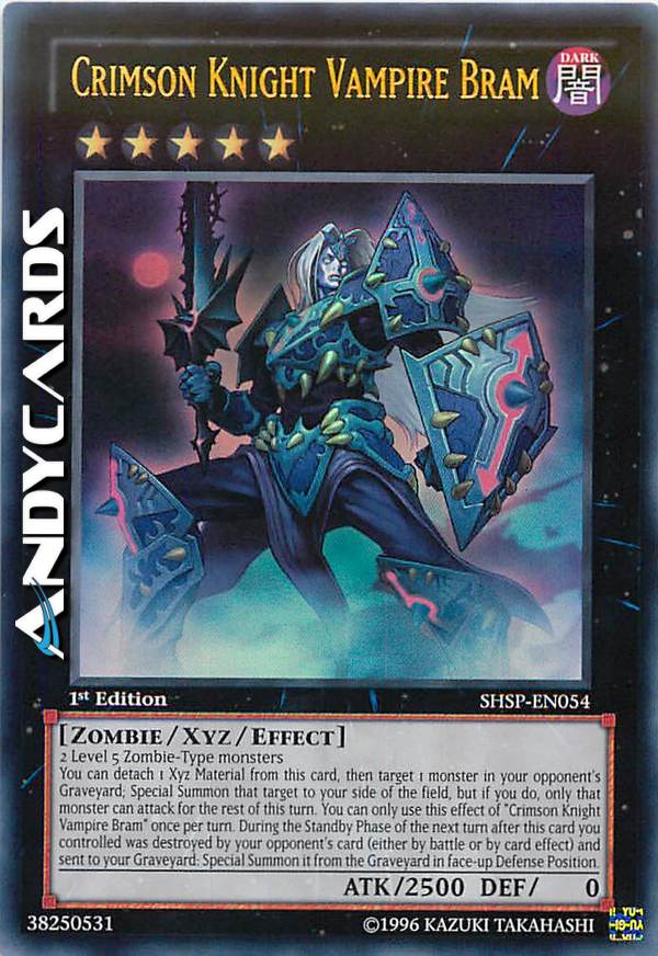 You can detach 1 material from this card, then target 1 monster in your opponent's GY; Special Summon that target to your field, but only that monster can attack for the rest of this turn. You can only use this effect of "Crimson Knight Vampire Bram" once per turn. Once per turn, during the Standby Phase of the next turn after this card you controlled was destroyed by your opponent's card and sent to your GY: Special Summon this card in Defense Position.