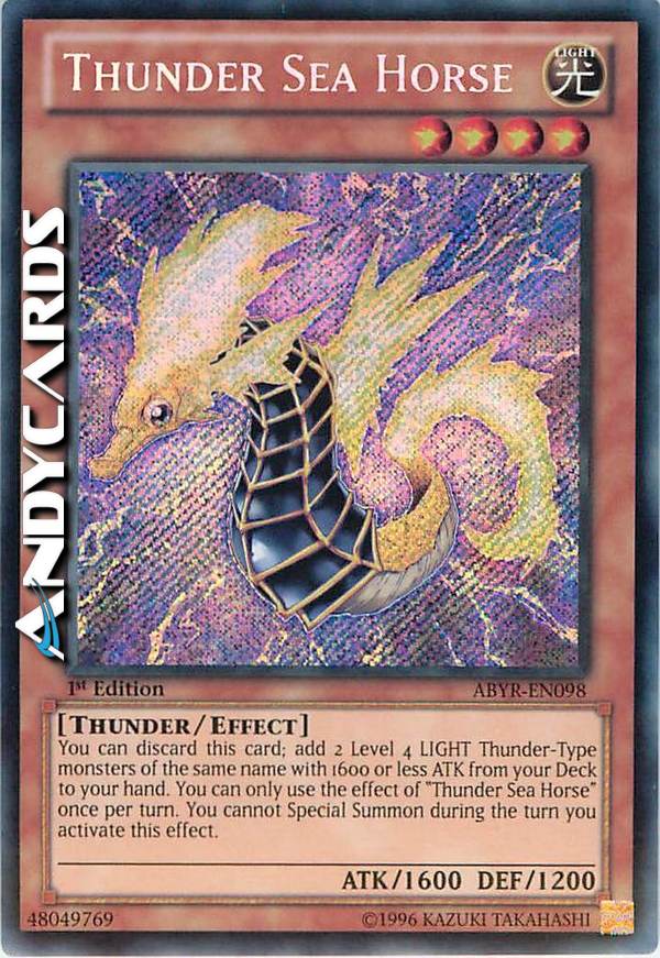 You can discard this card; add 2 Level 4 LIGHT Thunder-Type monsters of the same name with 1600 or less ATK from your Deck to your hand. You can only use the effect of "Thunder Sea Horse" once per turn. You cannot Special Summon during the turn you activate this effect.