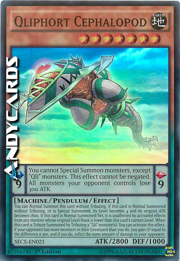 You can Normal Summon this card without Tributing. If this card is Normal Summoned without Tributing, or is Special Summoned, its Level becomes 4 and its original ATK becomes 1800. If this card is Normal Summoned/Set, it is unaffected by activated effects from any monster whose original Level/Rank is lower than this card's current Level. When this card is Tribute Summoned by Tributing a "Qli" monster(s): You can activate this effect; if your opponent has more monsters in their Graveyard than you do, you gain LP equal to the difference x 300, and if you do, inflict the same amount of damage to your opponent. Pendulum Scale: 9 Pendulum Effect: You cannot Special Summon monsters, except "Qli" monsters. This effect cannot be negated. All monsters your opponent controls lose 300 ATK.