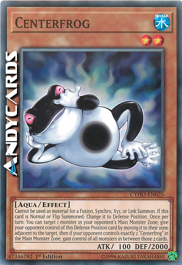 Cannot be used as material for a Fusion, Synchro, Xyz, or Link Summon. If this card is Normal or Flip Summoned: Change it to Defense Position. Once per turn: You can target 1 monster in your opponent's Main Monster Zone; give your opponent control of this Defense Position card by moving it to their zone adjacent to the target, then if your opponent controls exactly 2 "Centerfrog" in the Main Monster Zone, gain control of all monsters in between those 2 cards.
