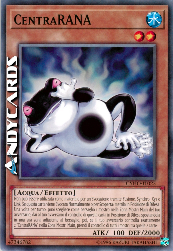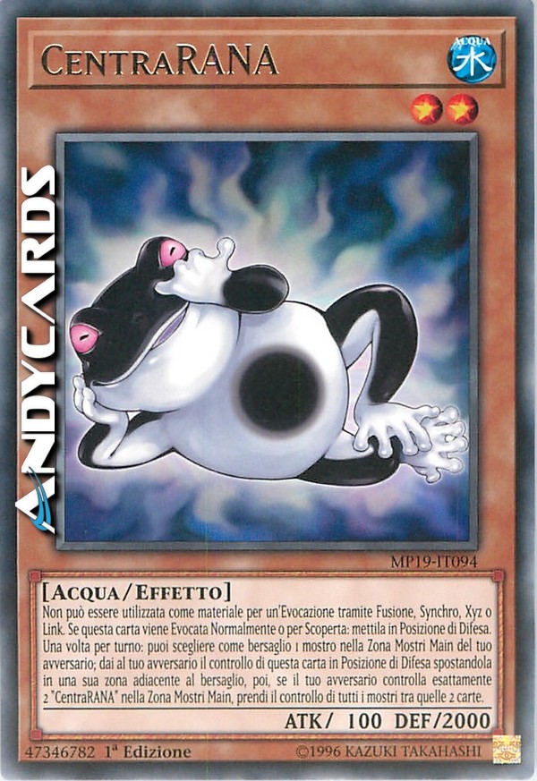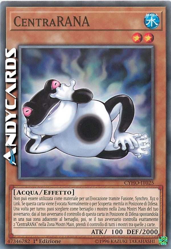 Non può essere utilizzata come materiale per un'Evocazione tramite Fusione, Synchro, Xyz o Link. Se questa carta viene Evocata Normalmente o per Scoperta: mettila in Posizione di Difesa. Una volta per turno: puoi scegliere come bersaglio 1 mostro nella Zona Mostri Main del tuo avversario; dai al tuo avversario il controllo di questa carta in Posizione di Difesa spostandola in una sua zona adiacente al bersaglio, poi, se il tuo avversario controlla esattamente 2 "CentraRANA" nella Zona Mostri Main, prendi il controllo di tutti i mostri tra quelle 2 carte.