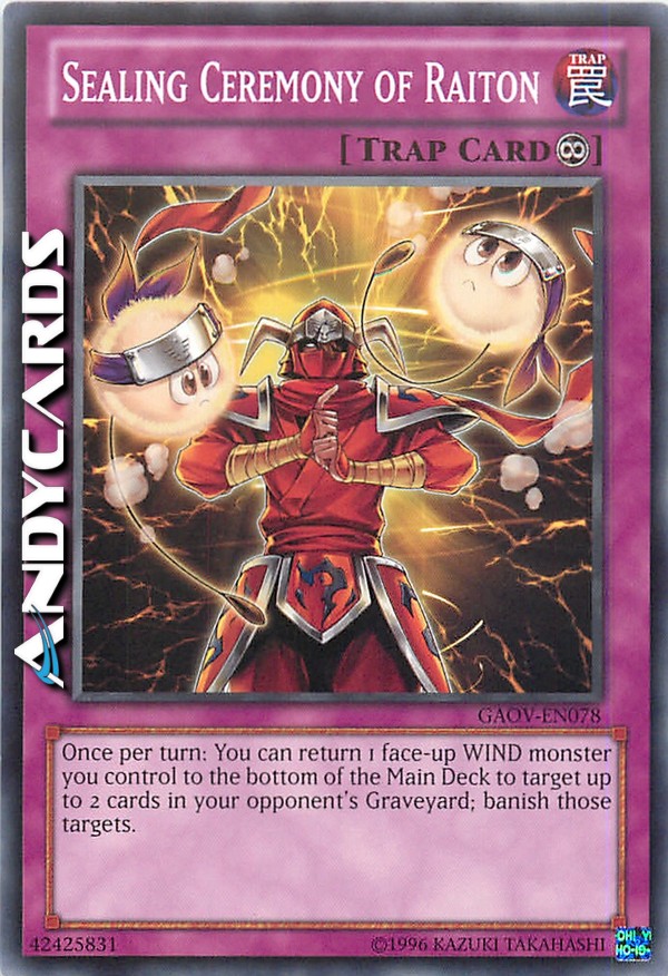 Una volta per turno: puoi far ritornare 1 mostro VENTO scoperto che controlli in fondo al Main Deck per scegliere come bersaglio fino a 2 carte nel Cimitero del tuo avversario; bandisci quei bersagli.