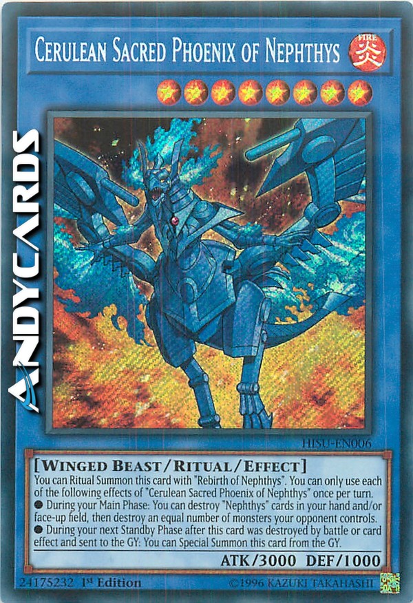You can Ritual Summon this card with "Rebirth of Nephthys". You can only use each of the following effects of "Cerulean Sacred Phoenix of Nephthys" once per turn.