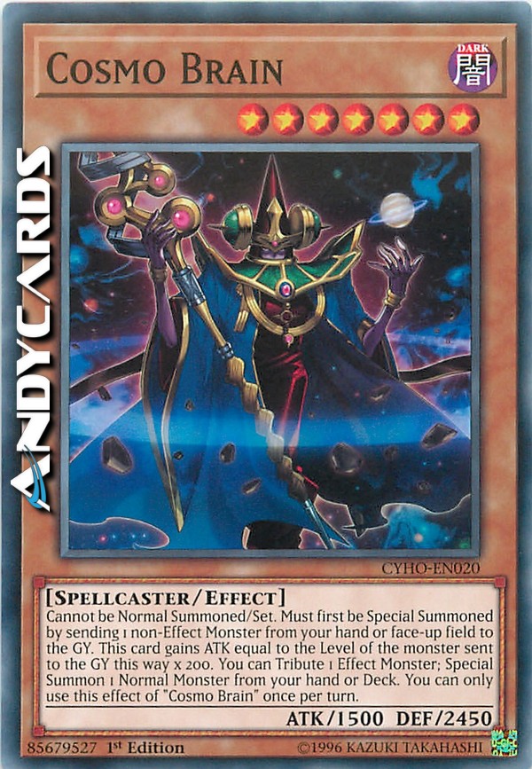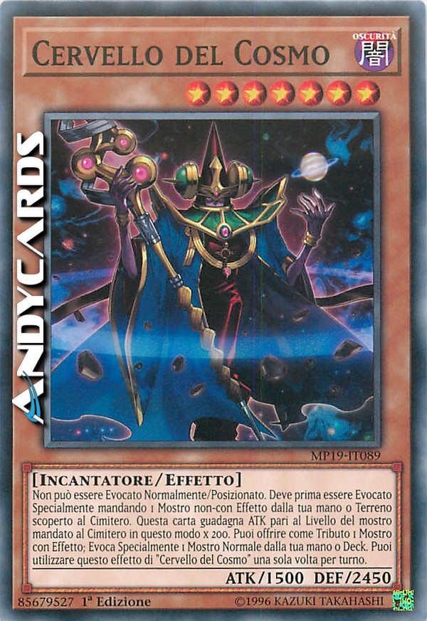 Non può essere Evocato Normalmente/Posizionato. Deve prima essere Evocato Specialmente mandando 1 Mostro non-con Effetto dalla tua mano o Terreno scoperto al Cimitero. Questa carta guadagna ATK pari al Livello del mostro mandato al Cimitero in questo modo x 200. Puoi offrire come Tributo 1 Mostro con Effetto; Evoca Specialmente 1 Mostro Normale dalla tua mano o Deck. Puoi utilizzare questo effetto di "Cervello del Cosmo" una sola volta per turno.