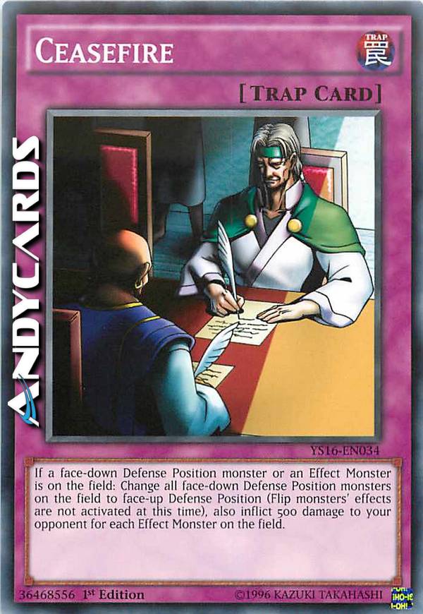 If a face-down Defense Position monster or an Effect Monster is on the field: Change all face-down Defense Position monsters on the field to face-up Defense Position (Flip monsters' effects are not activated at this time), also inflict 500 damage to your opponent for each Effect Monster on the field.