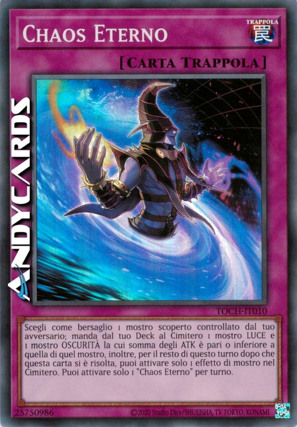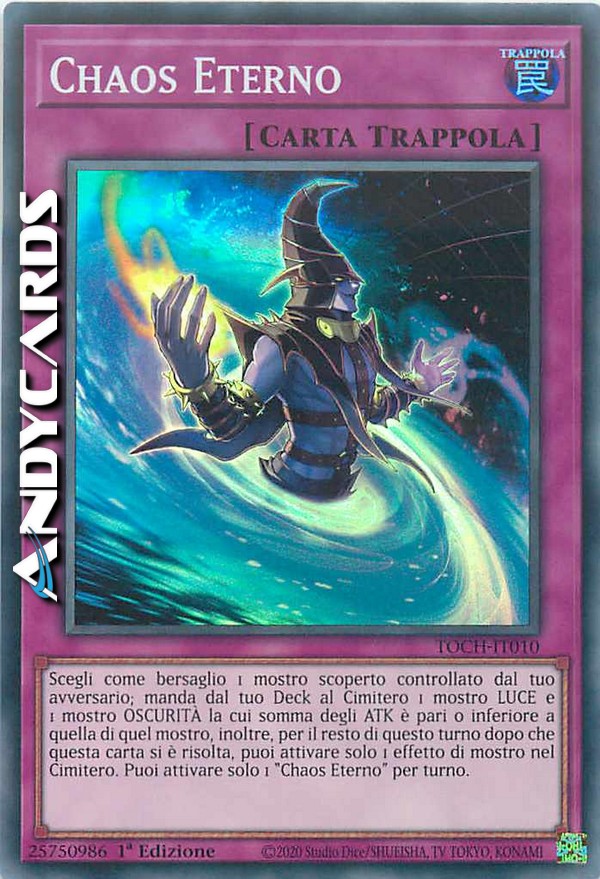 Scegli come bersaglio 1 mostro scoperto controllato dal tuo avversario; manda dal tuo Deck al Cimitero 1 mostro LUCE e 1 mostro OSCURITÀ la cui somma degli ATK è pari o inferiore a quella di quel mostro, inoltre, per il resto di questo turno dopo che questa carta si è risolta, puoi attivare solo 1 effetto di mostro nel Cimitero. Puoi attivare solo 1 "Chaos Eterno" per turno.
