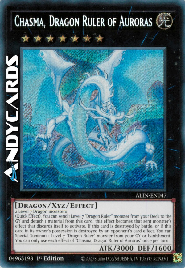 (Quick Effect): You can send 1 Level 7 "Dragon Ruler" monster from your Deck to the GY and detach 1 material from this card; this effect becomes that sent monster's effect that discards itself to activate. If this card is destroyed by battle, or if this card in its owner's possession is destroyed by an opponent's card effect: You can Special Summon 1 Level 7 "Dragon Ruler" monster from your GY or banishment. You can only use each effect of "Chasma, Dragon Ruler of Auroras" once per turn.