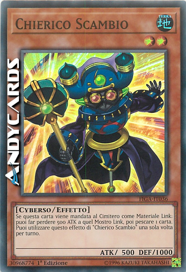 Se questa carta viene mandata al Cimitero come Materiale Link: puoi far perdere 500 ATK a quel Mostro Link, poi pescare 1 carta. Puoi utilizzare questo effetto di "Chierico Scambio" una sola volta per turno.