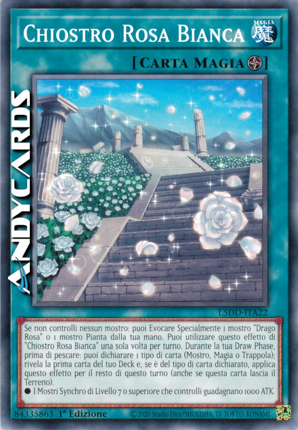 Se non controlli nessun mostro: puoi Evocare Specialmente 1 mostro "Drago Rosa" o 1 mostro Pianta dalla tua mano. Puoi utilizzare questo effetto di "Chiostro Rosa Bianca" una sola volta per turno. Durante la tua Draw Phase, prima di pescare: puoi dichiarare 1 tipo di carta (Mostro, Magia o Trappola); rivela la prima carta del tuo Deck e, se è del tipo di carta dichiarato, applica questo effetto per il resto di questo turno (anche se questa carta lascia il Terreno).