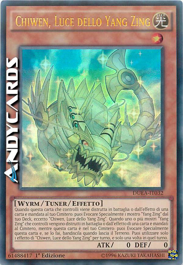 When this card you control is destroyed by battle or card effect and sent to your Graveyard: You can Special Summon 1 "Yang Zing" monster from your Deck, except "Chiwen, Light of the Yang Zing". When a "Yang Zing" monster(s) you control is destroyed by battle or card effect and sent to the Graveyard, while this card is in the Graveyard: You can Special Summon this card, and if you do, banish it when it leaves the field. You can only use 1 "Chiwen, Light of the Yang Zing" effect per turn, and only once that turn.