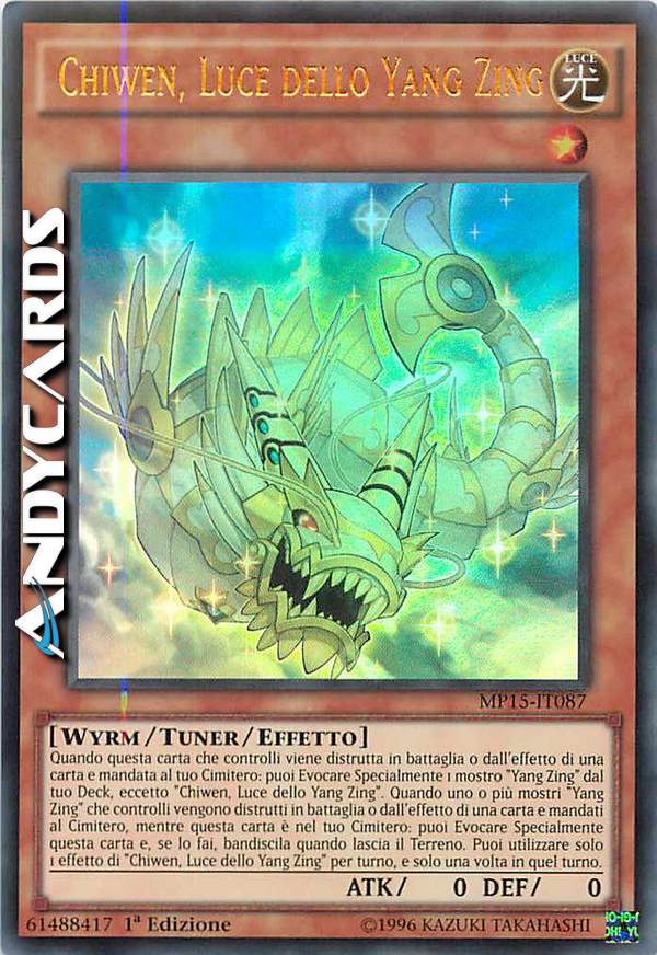 Quando questa carta che controlli viene distrutta in battaglia o dall'effetto di una carta e mandata al tuo Cimitero: puoi Evocare Specialmente 1 mostro "Yang Zing" dal tuo Deck, eccetto "Chiwen, Luce Dello Yang Zing". Quando uno o piu mostri "Yang Zing" che controlli vengono distrutti in battaglia o dall'effetto di una carta e mandati al Cimitero, Mentre questa carta è nel tuo Cimitero: puoi Evocare Specialmente questa carta e, se lo fai, bandiscila quando lascia il Terreno, Puoi utilizzare solo 1 Effetto di "Chiwen, Luce dello Yang Zing" per turno, e solo una volta in quel turnio.