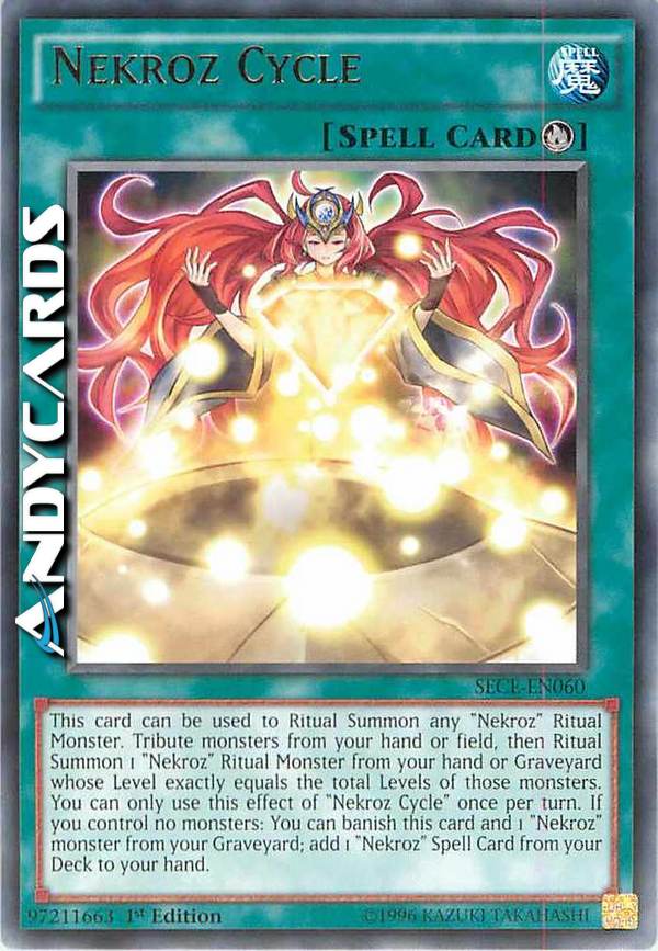 This card can be used to Ritual Summon any "Nekroz" Ritual Monster. Tribute monsters from your hand or field, then Ritual Summon 1 "Nekroz" Ritual Monster from your hand or Graveyard whose Level exactly equals the total Levels of those monsters. You can only use this effect of "Nekroz Cycle" once per turn. If you control no monsters: You can banish this card and 1 "Nekroz" monster from your Graveyard; add 1 "Nekroz" Spell Card from your Deck to your hand.