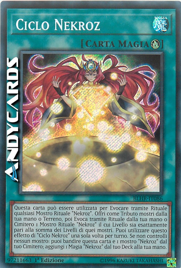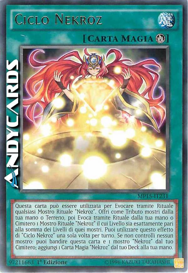 Questa carta può essere utilizzata per Evocare tramite Rituale qualsiasi Mostro Rituale "Nekroz". Offri come Tributo mostri dalla tua mano o Terreno, poi Evoca tramite Rituale dalal tua mano o Cimitero 1 Mostro Rituale "Nekroz" il cui Livello sia esattamente pari alla somma dei Livelli di quei mostri. Puoi utilizzare questo effetto di "Ciclo Nekroz" una sola volta per turno. Se non controlli nessun mostro: puoi bandire questa carta e 1 mostro "Nekroz" dal tuo Cimitero; aggiungi 1 carta magia "Nekroz" dal tuo Deck alla tua mano.