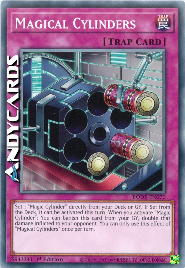 Set 1 "Magic Cylinder" directly from your Deck or GY. If Set from the Deck, it can be activated this turn. When you activate "Magic Cylinder": You can banish this card from your GY; double that damage inflicted to your opponent. You can only use this effect of "Magical Cylinders" once per turn.