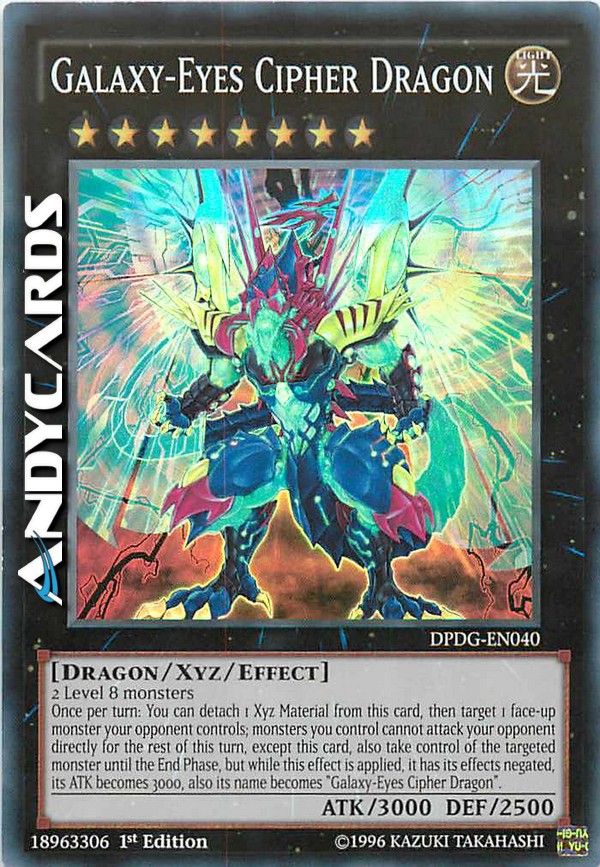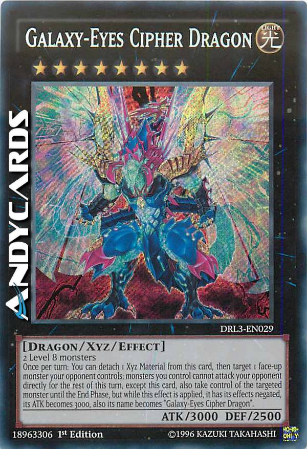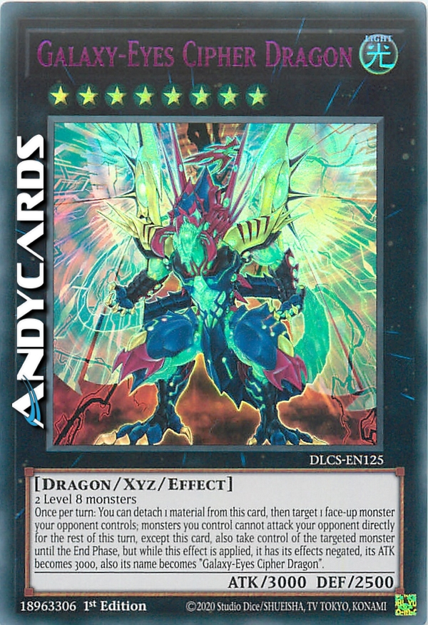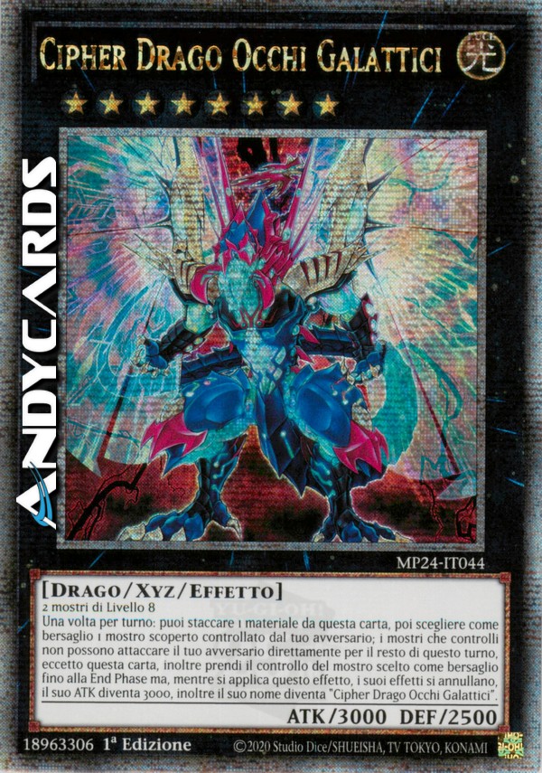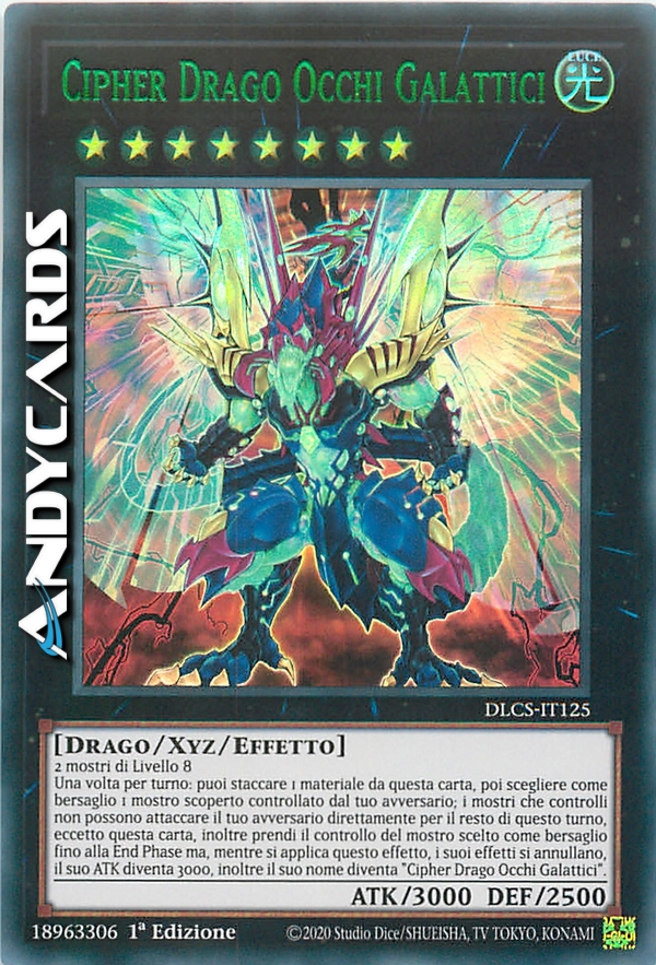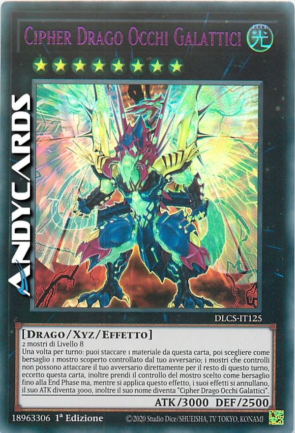 2 mostri di Livello 8 - Una volta per turno: puoi staccare 1 Materiale Xyz da questa carta, poi scegliere come bersaglio 1 mostro scoperto controllato dal tuo avversario; i mostri che controlli non possono attaccare il tuo avversario direttamente per il resto di questo turno, eccetto questa carta, inoltre prendi il controllo del mostro scelto come bersaglio fino alla End Phase ma, mentre si applica questo effetto, i suoi effetti si annullano, il suo ATK diventa 3000, inoltre il suo nome diventa "Cipher Drago Occhi Galattici".