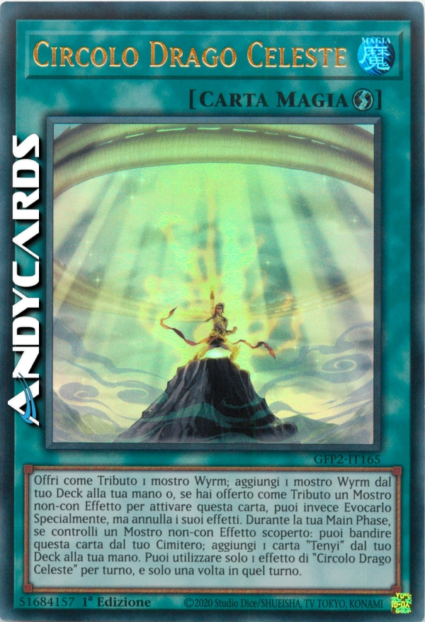 Offri come Tributo 1 mostro Wyrm; aggiungi 1 mostro Wyrm dal tuo Deck alla tua mano o, se hai offerto come Tributo un Mostro non-con Effetto per attivare questa carta, puoi invece Evocarlo Specialmente, ma annulla i suoi effetti. Durante la tua Main Phase, se controlli un Mostro non-con Effetto scoperto: puoi bandire questa carta dal tuo Cimitero; aggiungi 1 carta "Tenyi" dal tuo Deck alla tua mano. Puoi utilizzare solo 1 effetto di "Circolo Drago Celeste" per turno, e solo una volta in quel turno.