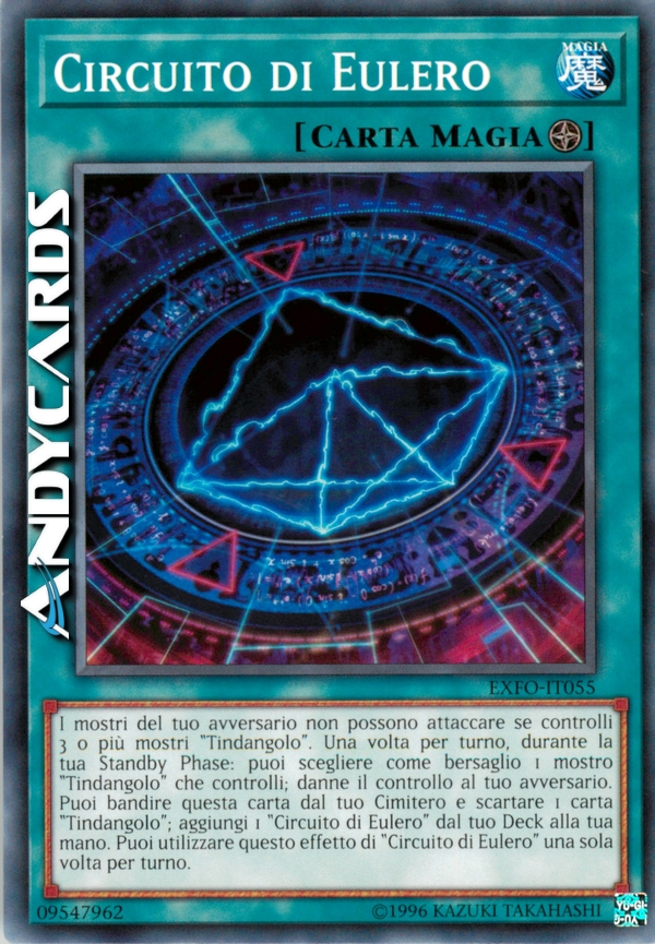 I mostri del tuo avversario non possono attaccare se controlli 3 o più mostri "Tindangolo". Una volta per turno, durante la tua Standby Phase: puoi scegliere come bersaglio 1 mostro "Tindangolo" che controlli; danne il controllo al tuo avversario. Puoi bandire questa carta dal tuo Cimitero e scartare 1 carta "Tindangolo"; aggiungi 1 "Circuito di Eulero" dal tuo Deck alla tua mano. Puoi utilizzare questo effetto di "Circuito di Eulero" una sola volta per turno.