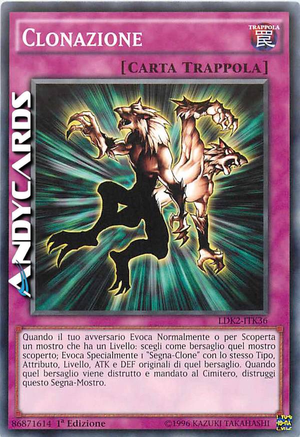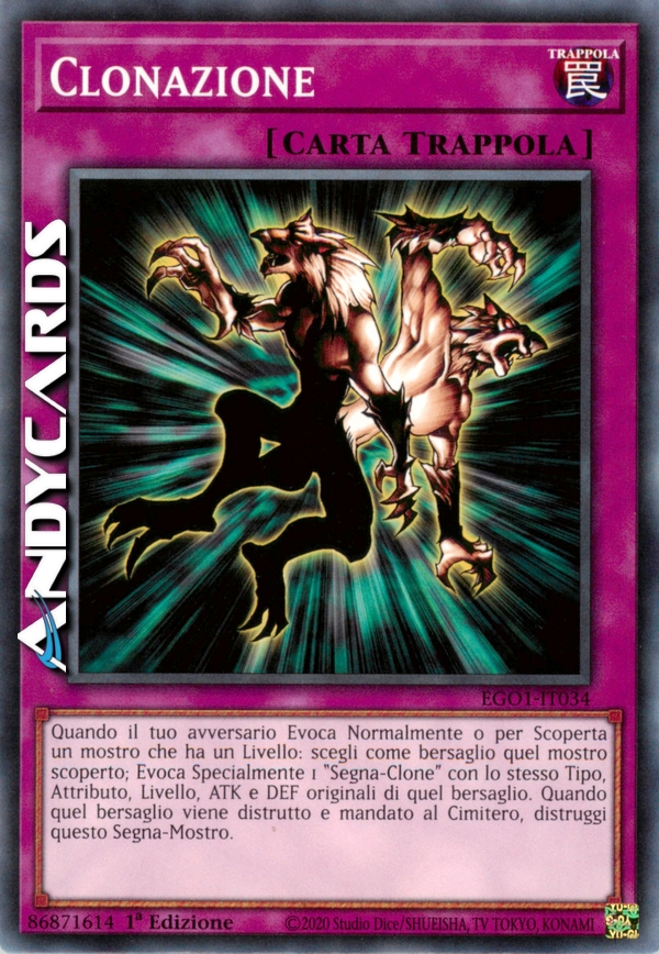 Quando il tuo avversario Evoca Normalmente o per Scoperta un mostro che ha un Livello: scegli come bersaglio quel mostro scoperto; Evoca Specialmente 1 "Segna-Clone" con lo stesso Tipo, Attributo, Livello, ATK e DEF originali di quel bersaglio. Quando quel bersaglio viene distrutto e mandato al Cimitero, distruggi questo Segna-Mostro.
