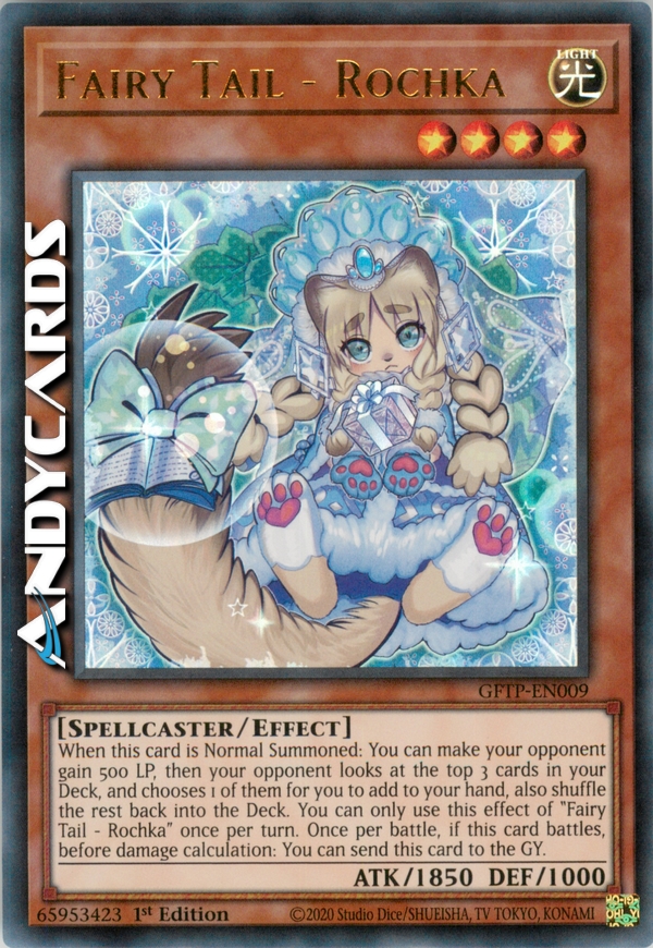 Quando questa carta viene Evocata Normalmente: puoi far guadagnare 500 LP al tuo avversario, poi il tuo avversario guarda le prime 3 carte del tuo Deck, e ne seleziona 1 da aggiungere alla tua mano, inoltre rimischia il resto nel Deck. Puoi utilizzare questo effetto di "Codafavola - Rochka" una sola volta per turno. Una volta per battaglia, se questa carta combatte, prima del calcolo dei danni: puoi mandare questa carta al Cimitero.