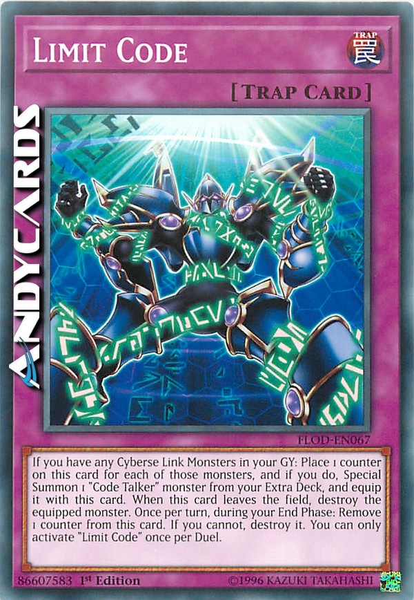 If you have any Cyberse Link Monsters in your GY: Place 1 counter on this card for each of those monsters, and if you do, Special Summon 1 "Code Talker" monster from your Extra Deck, and equip it with this card. When this card leaves the field, destroy the equipped monster. Once per turn, during your End Phase: Remove 1 counter from this card. If you cannot, destroy it. You can only activate "Limit Code" once per Duel.