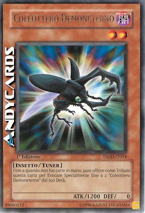 Fino a quando non hai carte in mano, puoi offrire come Tributo questa carta per Evocare Specialmente fino a 2 "Coleottero Demoneterno" dal tuo Deck.