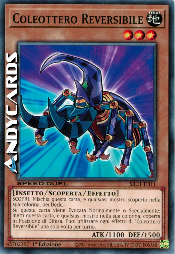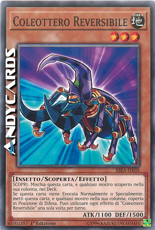 Se questa carta viene Evocata Normalmente o Specialmente: metti questa carta, e qualsiasi mostro nella sua colonna, coperta in Posizione di Difesa. Puoi utilizzare ogni effetto di "Coleottero Reversibile" una sola volta per turno.