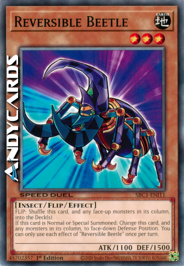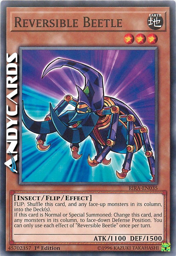 If this card is Normal or Special Summoned: Change this card, and any monsters in its column, to face-down Defense Position. You can only use each effect of "Reversible Beetle" once per turn.