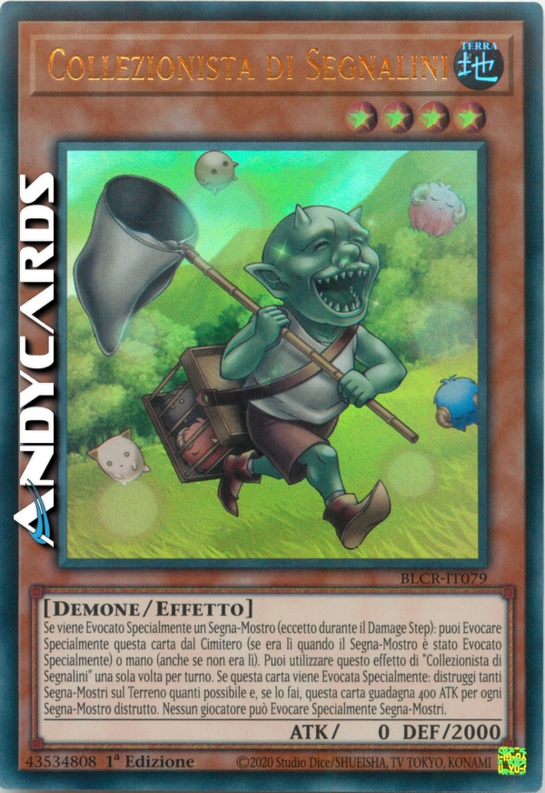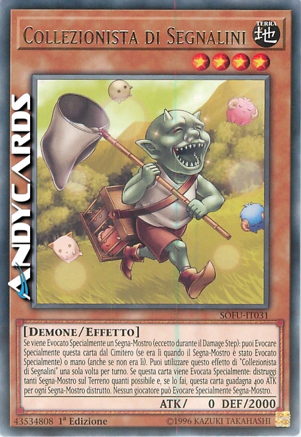 Se viene Evocato Specialmente un Segna-Mostro (eccetto durante il Damage Step): puoi Evocare Specialmente questa carta dal Cimitero (se era lì quando il Segna-Mostro è stato Evocato Specialmente) o mano (anche se non era lì). Puoi utilizzare questo effetto di "Collezionista di Segnalini" una sola volta per turno. Se questa carta viene Evocata Specialmente: distruggi tanti Segna-Mostro sul Terreno quanti possibile e, se lo fai, questa carta guadagna 400 ATK per ogni Segna-Mostro distrutto. Nessun giocatore può Evocare Specialmente Segna-Mostro.