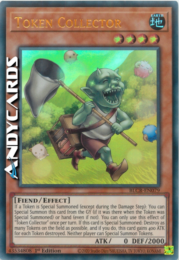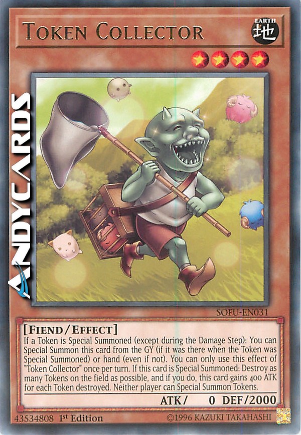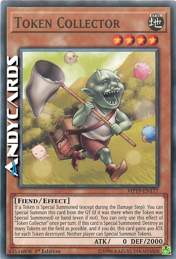 If a Token is Special Summoned (except during the Damage Step): You can Special Summon this card from the GY (if it was there when the Token was Special Summoned) or hand (even if not). You can only use this effect of "Token Collector" once per turn. If this card is Special Summoned: Destroy as many Tokens on the field as possible, and if you do, this card gains 400 ATK for each Token destroyed. Neither player can Special Summon Tokens.