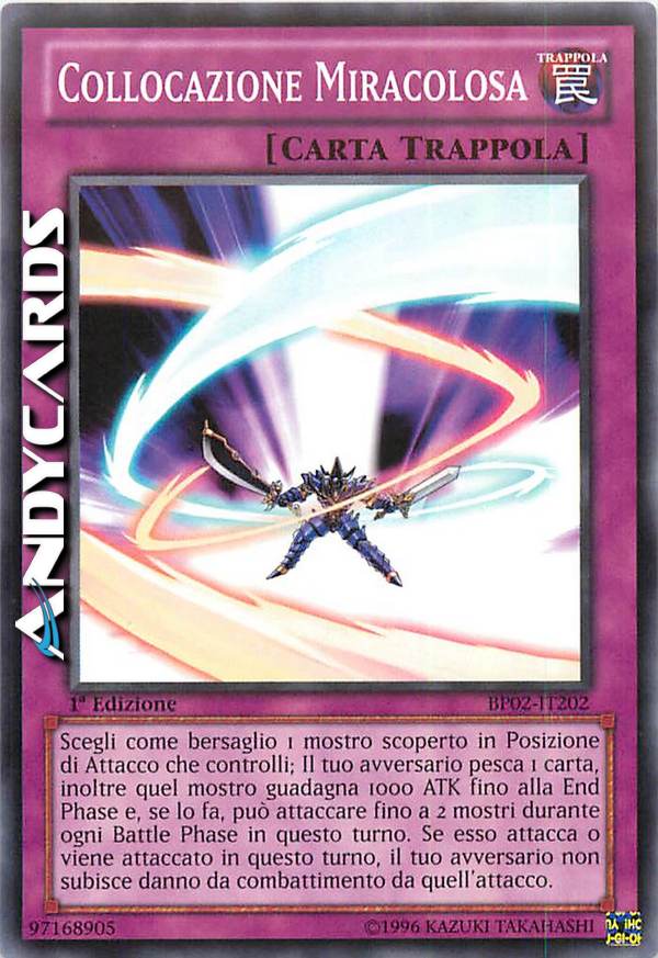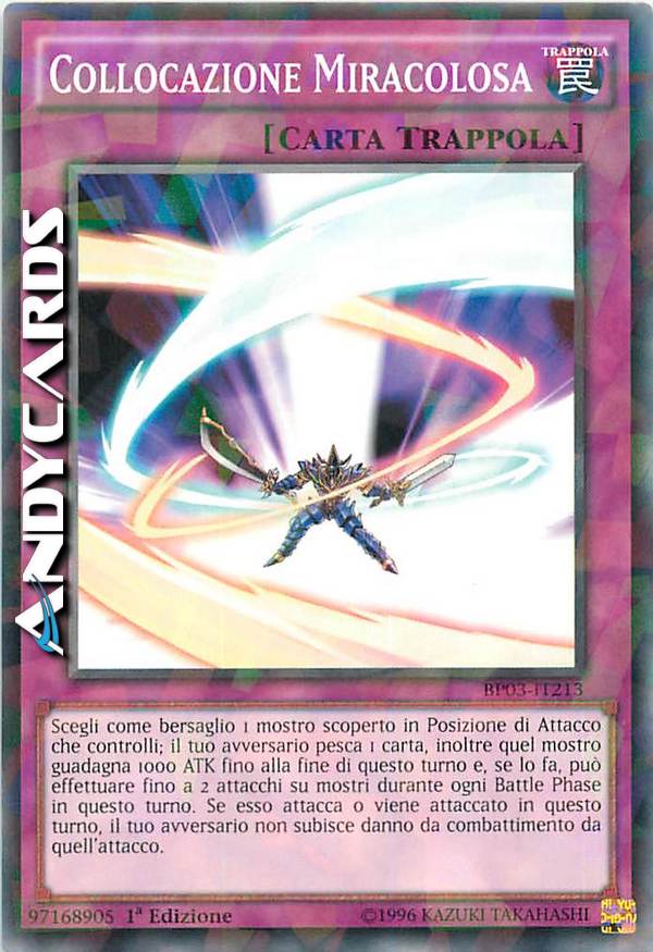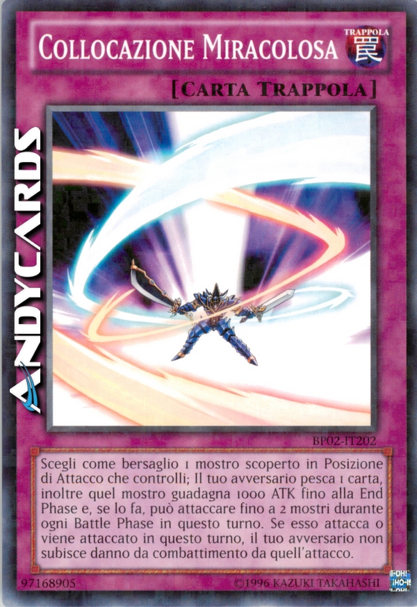 Scegli 1 mostro scoperto in Posizione di Attacco che controlli. Il tuo avversario pesca 1 carta. Il mostro scelto guadagna 1000 ATK fino alla End Phase e può attaccare fino a 2 mostri durante la Battle Phase di questo turno. Quando attacca o viene attaccato questo turno, il tuo avversario non subisce danni da combattimento.