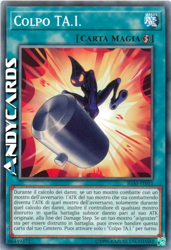 Durante il calcolo dei danni, se un tuo mostro combatte con un mostro dell'avversario: l'ATK del tuo mostro che sta combattendo diventa l'ATK di quel mostro dell'avversario, solamente durante quel calcolo dei danni, inoltre il controllore di qualsiasi mostro distrutto in quella battaglia subisce danno pari al suo ATK originale, alla fine del Damage Step. Se un tuo mostro "@Ignister" sta per essere distrutto in battaglia, puoi invece bandire questa carta dal tuo Cimitero. Puoi attivare solo 1 "Colpo TA.I." per turno.