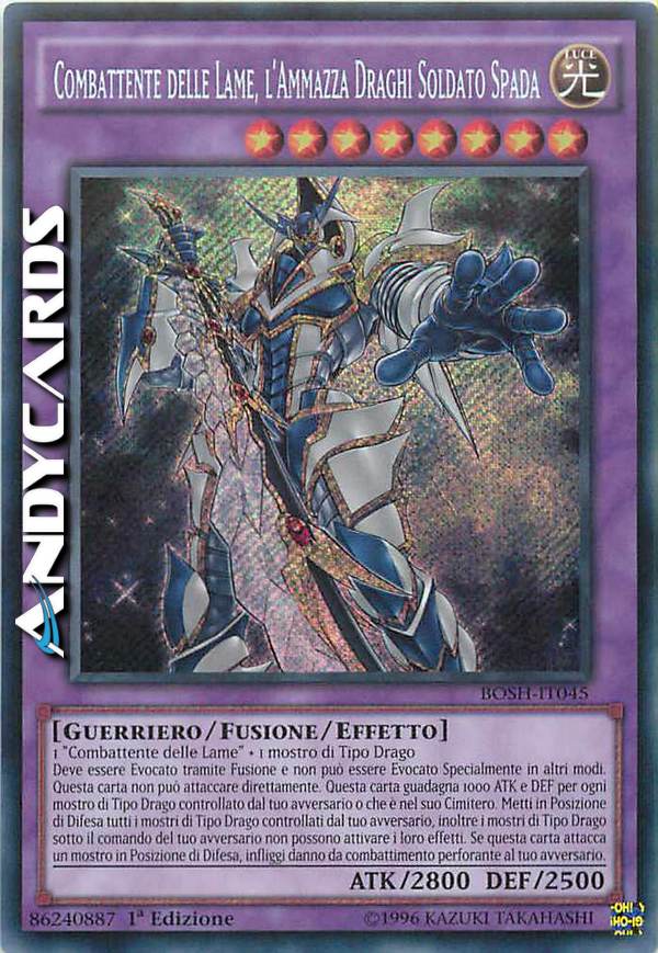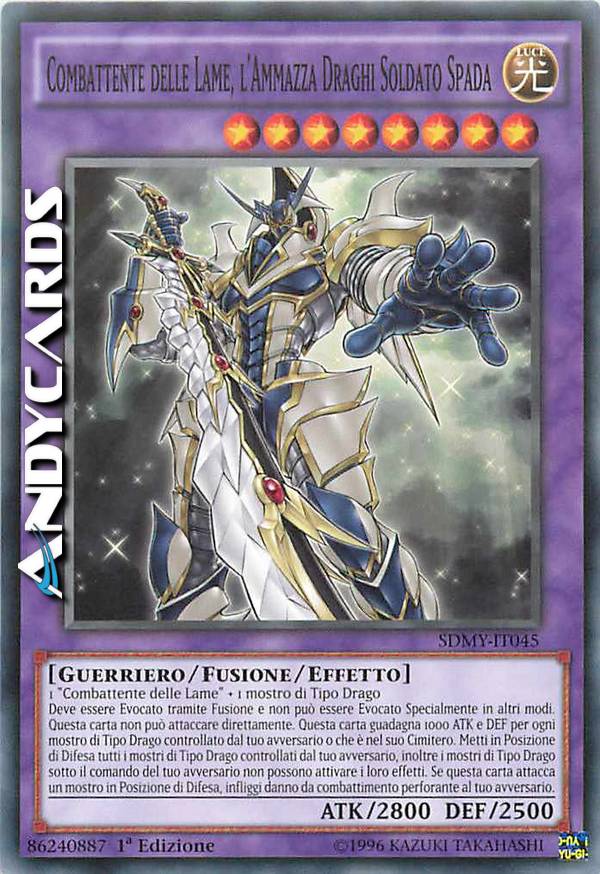 1 "Combattente delle Lame" + 1 mostro di Tipo Drago - Deve essere Evocato tramite Fusione e non può essere Evocato Specialmente in altri modi. Questa carta non può attaccare direttamente. Questa carta guadagna 1000 ATK e DEF per ogni mostro di Tipo Drago controllato dal tuo avversario o che è nel suo Cimitero. Metti in Posizione di Difesa tutti i mostri di Tipo Drago controllati dal tuo avversario, inoltre i mostri di Tipo Drago sotto il comando del tuo avversario non possono attivare i loro effetti. Se questa carta attacca un mostro in Posizione di Difesa, infliggi danno da combattimento perforante al tuo avversario.