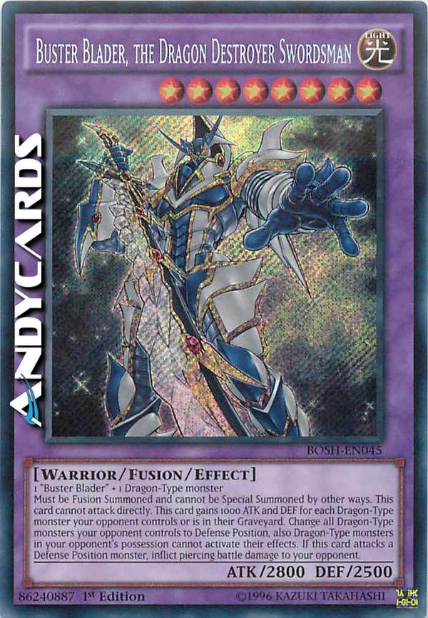 1 "Buster Blader" + 1 Dragon-Type Monster - Must be Fusion Summoned and cannot be Special Summoned by other ways. This card cannot attack directly. This card gains 1000 ATK and DEF for each Dragon-Type monster your opponent controls or is in their Graveyard. Change all Dragon-Type monsters your opponent controls to Defense Position, also Dragon-Type monsters in your opponent's possession cannot activate their effects. If this card attacks a Defense Position monster, inflict piercing battle damage to your opponent.