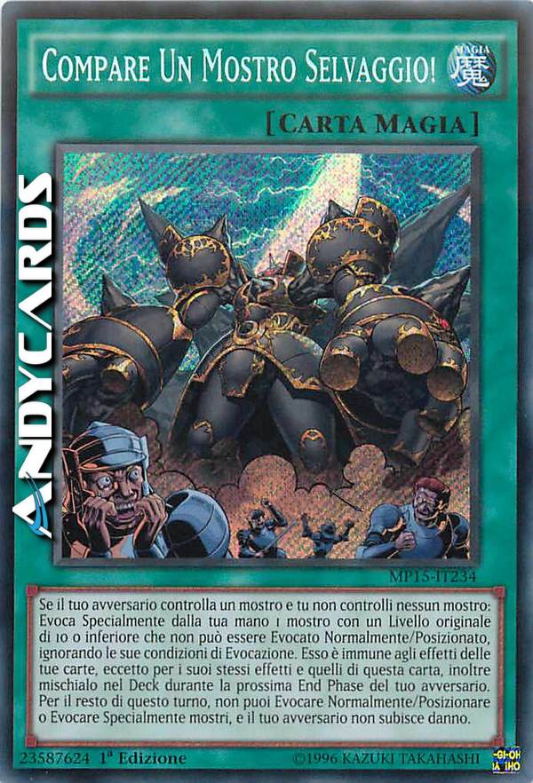Se solo il tuo avversario controlla un mostro: Evoca Specialmente dalla tua mano 1 mostro con un Livello originale di 10 o inferiore che non può essere Evocato Normalmente/Posizionato, ignorando le sue condizioni di Evocazione. Esso è immune agli effetti delle tue carte, eccetto per i suoi stessi effetti e quelli di questa carta, inoltre mischialo nel Deck durante la prossima End Phase del tuo avversario. Per il resto di questo turno, non puoi Evocare Normalmente/Posizionare o Evocare Specialmente mostri, e il tuo avversario non subisce danno.