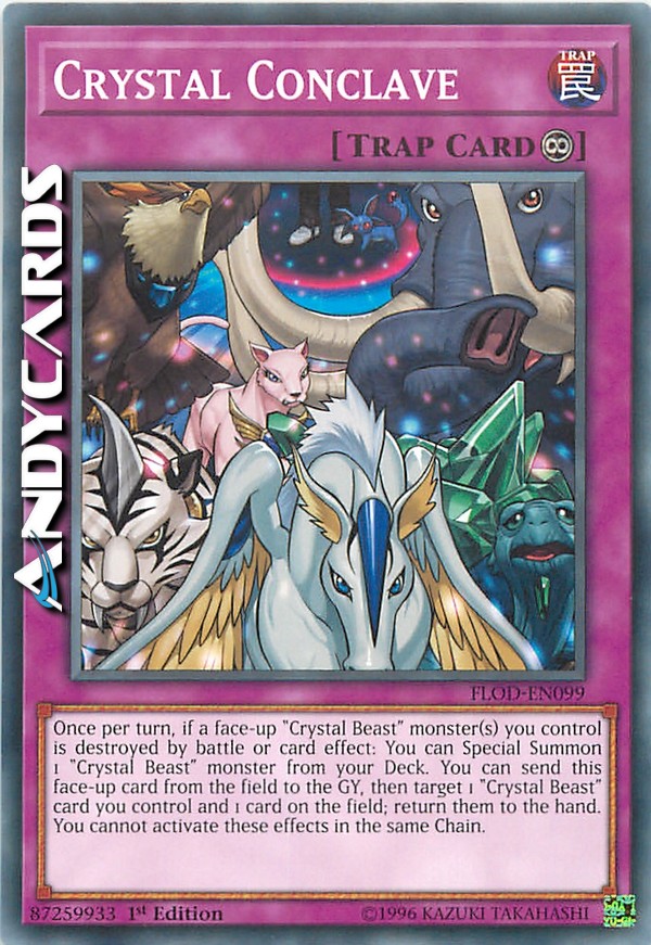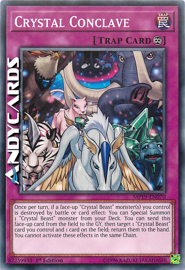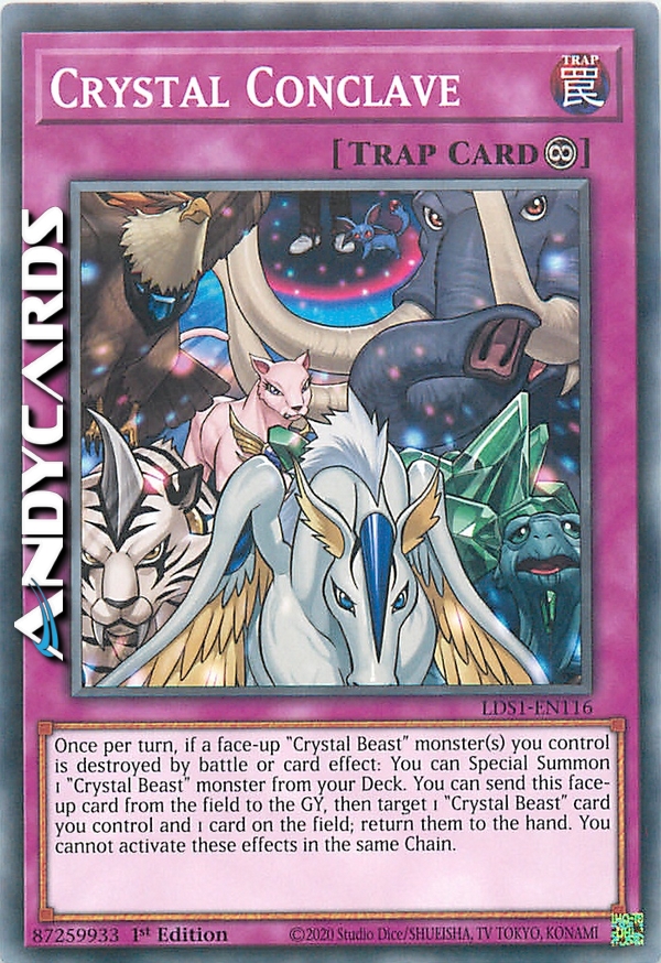 Once per turn, if a face-up "Crystal Beast" monster(s) you control is destroyed by battle or card effect: You can Special Summon 1 "Crystal Beast" monster from your Deck. You can send this face-up card from the field to the GY, then target 1 "Crystal Beast" card you control and 1 card on the field; return them to the hand. You cannot activate these effects in the same Chain.