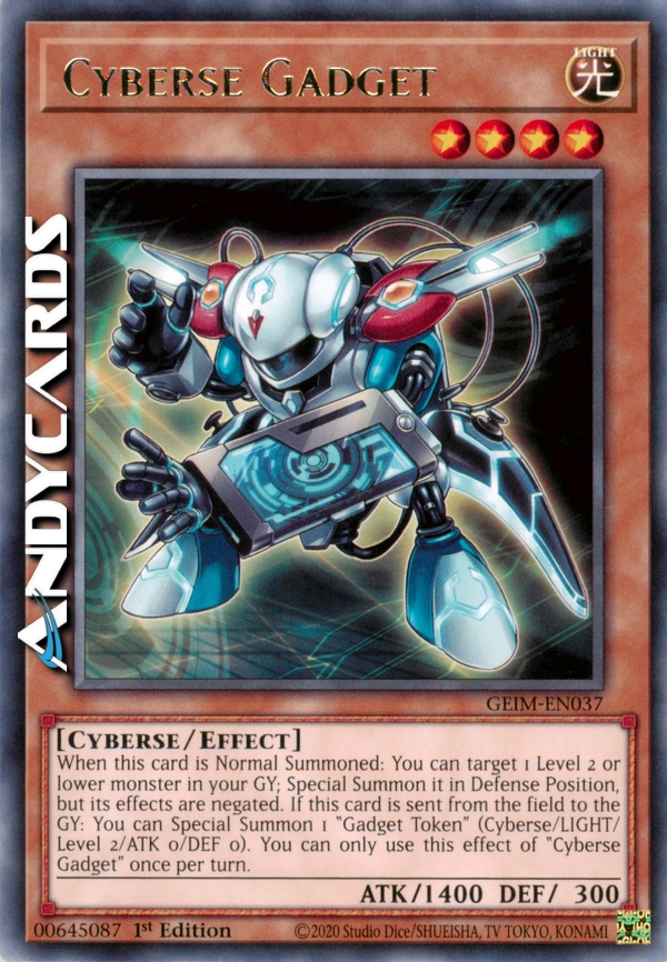 When this card is Normal Summoned: You can target 1 Level 2 or lower monster in your GY; Special Summon it in Defense Position, but its effects are negated. If this card is sent from the field to the GY: You can Special Summon 1 "Gadget Token" (Cyberse/LIGHT/Level 2/ATK 0/DEF 0). You can only use this effect of "Cyberse Gadget" once per turn.