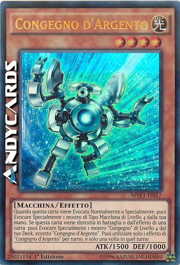 Quando questa carta viene Evocata Normalmente o Specialmente: puoi Evocare Specialmente 1 mostro di Tipo Macchina di Livello 4 dalla tua mano. Se questa carta viene distrutta in battaglia o dall'effetto di una carta: puoi Evocare Specialmente 1 mostro "Congegno" di Livello 4 dal tuo Deck, eccetto "Congegno d'Argento". Puoi utilizzare solo 1 effetto di "Congegno d'Argento" per turno, e solo una volta in quel turno.