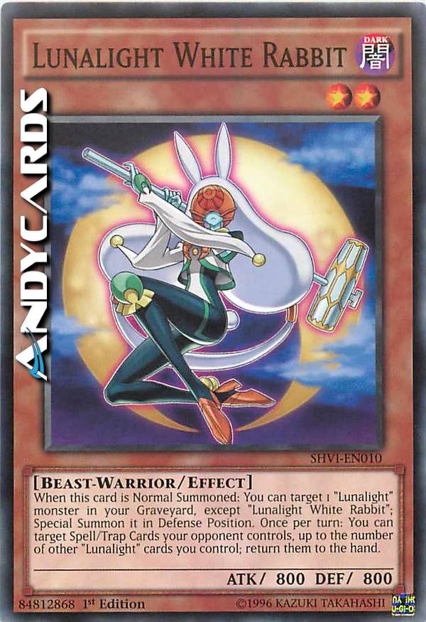 Quando questa carta viene Evocata Normalmente: puoi scegliere come bersaglio 1 mostro "Lucelunare" nel tuo Cimitero, eccetto "Coniglio Bianco della Lucelunare"; Evocalo Specialmente in Posizione di Difesa. Una volta per turno: puoi scegliere come bersaglio Carte Magia/Trappola controllate dal tuo avversario fino al massimo al numero di altre carte "Lucelunare" che controlli; falle ritornare nella mano.