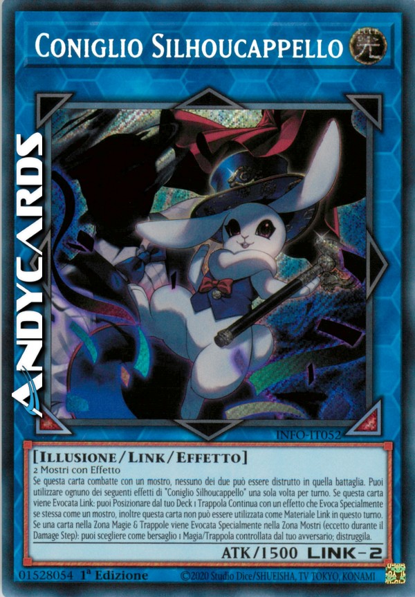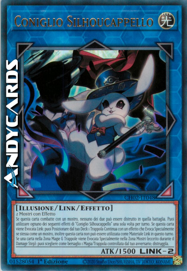 2 Mostri con Effetto Se questa carta combatte con un mostro, nessuno dei due può essere distrutto in quella battaglia. Puoi utilizzare ognuno dei seguenti effetti di "Coniglio Silhoucappello" una sola volta per turno. Se questa carta viene Evocata Link: puoi Posizionare dal tuo Deck 1 Trappola Continua con un effetto che Evoca Specialmente se stessa come un mostro, inoltre questa carta non può essere utilizzata come Materiale Link in questo turno. Se una carta nella Zona Magie & Trappole viene Evocata Specialmente nella Zona Mostri (eccetto durante il Damage Step): puoi scegliere come bersaglio 1 Magia/Trappola controllata dal tuo avversario; distruggila.