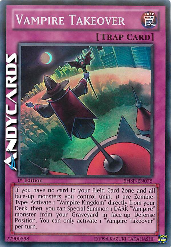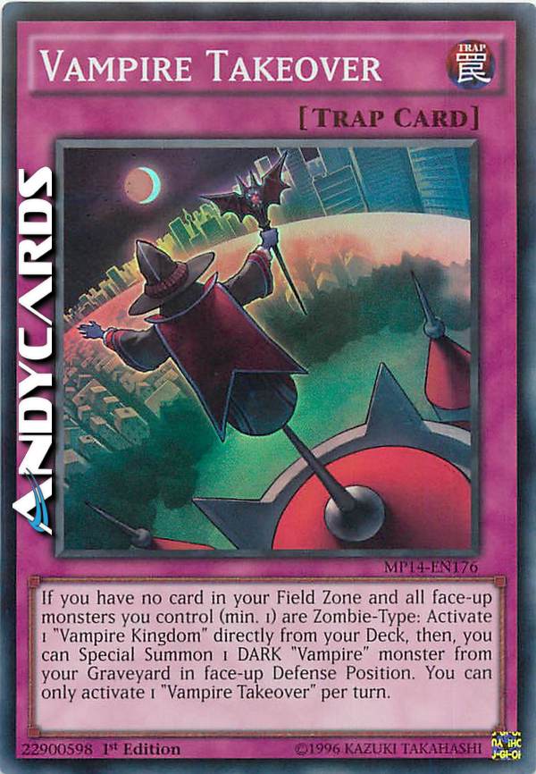 If you have no card in your Field Zone and all face-up monsters you control (min. 1) are Zombie-Type: Activate 1 "Vampire Kingdom" directly from your Deck, then, you can Special Summon 1 DARK "Vampire" monster from your Graveyard in face-up Defense Position. You can only activate 1 "Vampire Takeover" per turn.