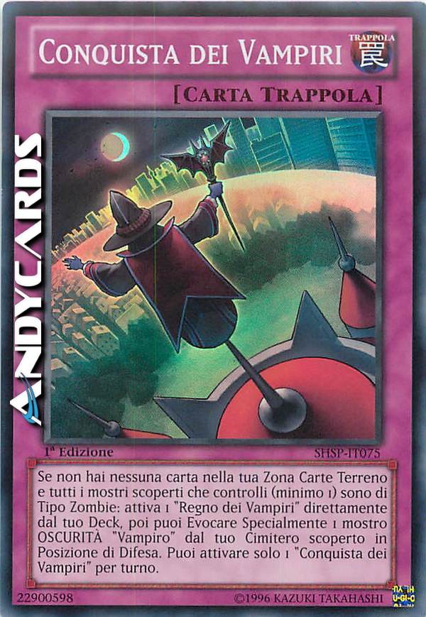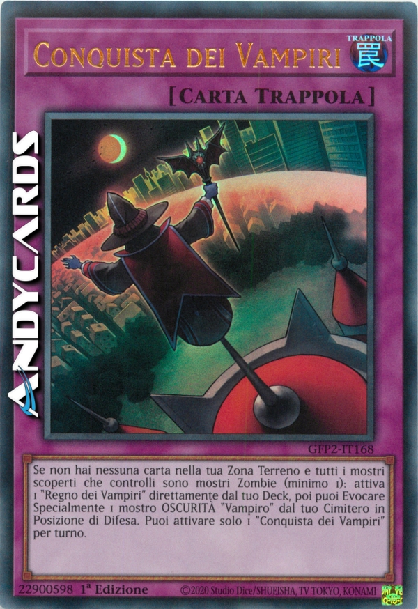 Se non hai nessuna carta nella tua Zona Terreno e tutti i mostri scoperti che controlli (minimo 1) sono di Tipo Zombie: attiva 1 "Regno dei Vampiri" direttamente dal tuo Deck, poi puoi Evocare Specialmente 1 mostro OSCURITÀ "Vampiro" dal tuo Cimitero scoperto in Posizione di Difesa. Puoi attivare solo 1 "Conquista dei Vampiri" per turno.