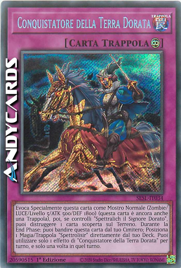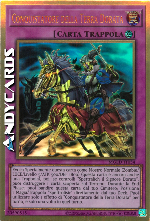 Evoca Specialmente questa carta come Mostro Normale (Zombie/LUCE/Livello 5/ATK 500/DEF 1800) (questa carta è ancora anche una Trappola), poi, se controlli "Spettralich il Signore Dorato", puoi distruggere 1 carta scoperta sul Terreno. Durante la End Phase: puoi bandire questa carta dal tuo Cimitero; Posiziona 1 Magia/Trappola "Spettrolisir" direttamente dal tuo Deck. Puoi utilizzare solo 1 effetto di "Conquistatore della Terra Dorata" per turno, e solo una volta in quel turno.