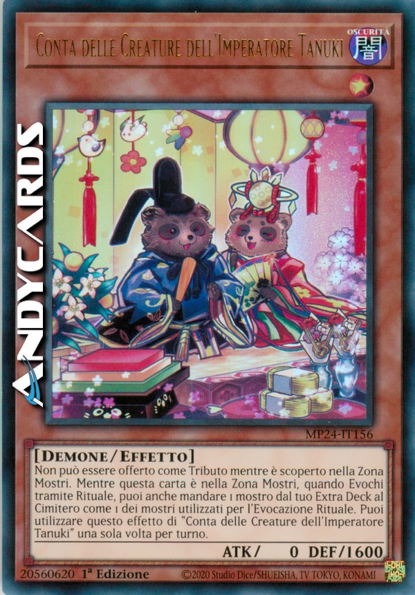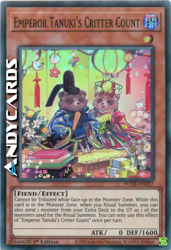 Non può essere offerto come Tributo mentre è scoperto nella Zona Mostri. Mentre questa carta è nella Zona Mostri, quando Evochi tramite Rituale, puoi anche mandare 1 mostro dal tuo Extra Deck al Cimitero come 1 dei mostri utilizzati per l'Evocazione Rituale. Puoi utilizzare questo effetto di "Conta delle Creature dell'Imperatore Tanuki" una sola volta per turno.