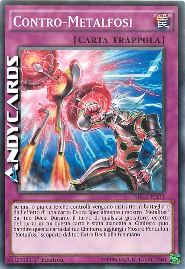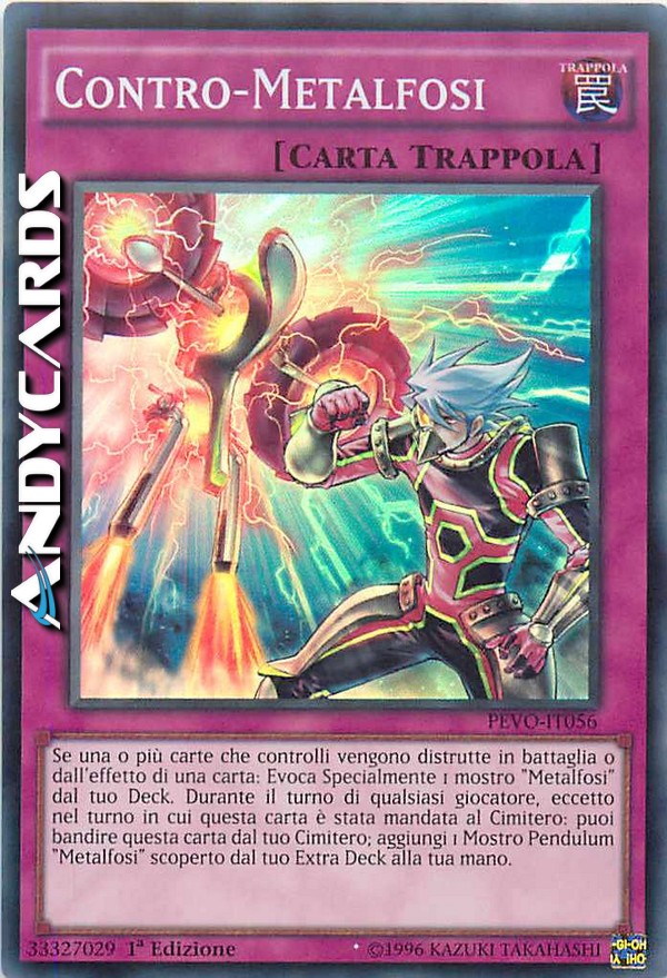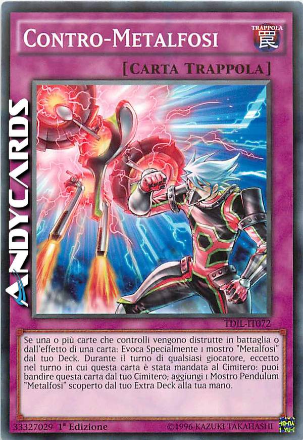 Se una o più carte che controlli vengono distrutte in battaglia o dall'effetto di una carta: Evoca Specialmente 1 mostro "Metalfosi" dal tuo Deck. Durante il turno di qualsiasi giocatore, eccetto nel turno in cui questa carta è stata mandata al Cimitero: puoi bandire questa carta dal tuo Cimitero; aggiungi 1 Mostro Pendulum "Metalfosi" scoperto dal tuo Extra Deck alla tua mano.