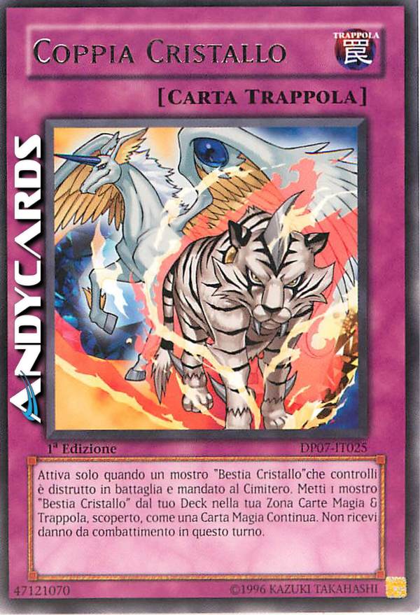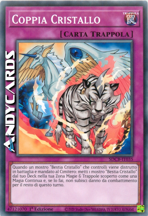 Attiva solo quando un mostro "Bestia Cristallo" che controlli è distrutto in battaglia e mandato al Cimitero. Metti 1 mostro "Bestia Cristallo" dal tuo Deck nella tua Zona Carte Magia e Trappola, scoperto come una Carta Magia Continua. Non ricevi danno da combattimento in questo turno.