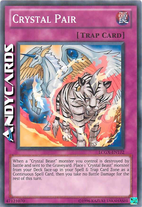 When a "Crystal Beast" monster you control is destroyed by battle and sent to the Graveyard: Place 1 "Crystal Beast" monster from your Deck face-up in your Spell & Trap Card Zone as a Continuous Spell Card, then you take no Battle Damage for the rest of this turn.